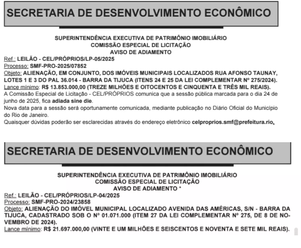 Prefeitura do Rio coloca dois terrenos, na Barra da Tijuca e no Jardim Oceânico, em leilão com lances iniciais de R$ 21,6 milhões e R$ 13,8 milhões 9 de junho de 2025 Leia Mais