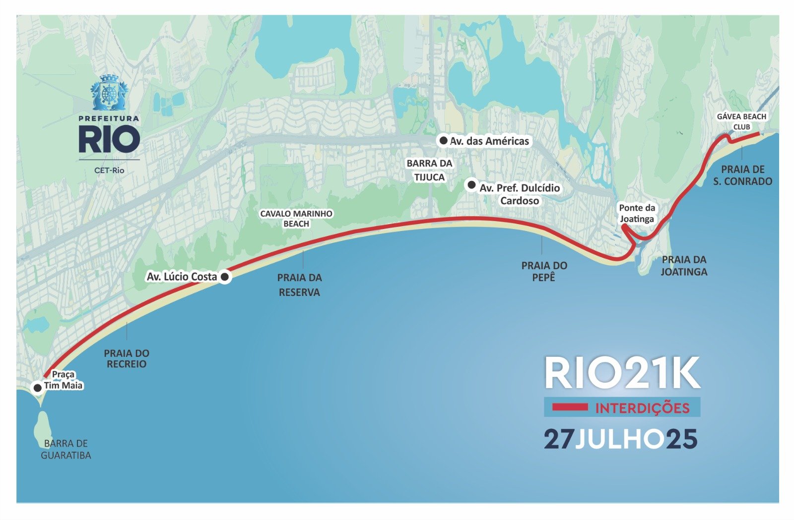 A CET-Rio informa que, em função da realização da Corrida Rio 21k, neste domingo (27/7), serão implementadas diversas interdições ao trânsito de veículos em vias da Barra da Tijuca, São Conrado, Joá e Recreio dos Bandeirantes. As intervenções serão realizadas ao longo do dia, com início ainda na madrugada, e contarão com o apoio da Guarda Municipal e operadores de tráfego para orientar os motoristas e minimizar os impactos no trânsito.