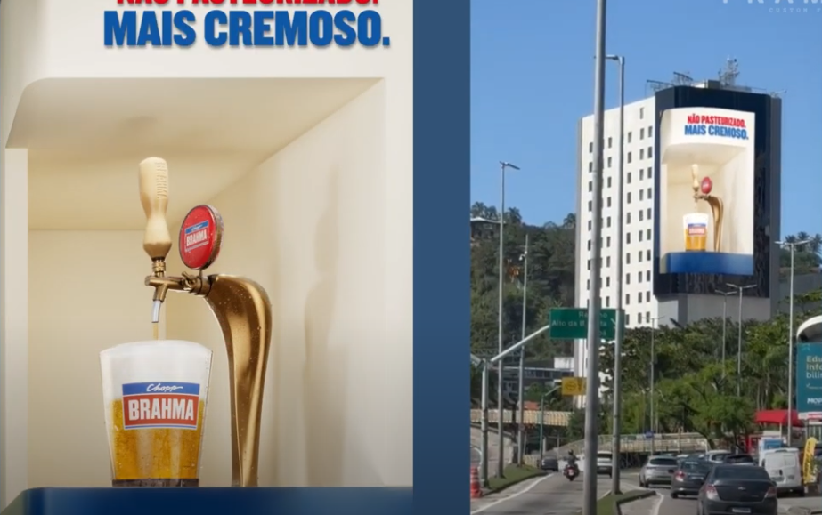 Para reforçar a cremosidade do Chopp Brahma, durante os jogos do Campeonato Brasileiro, foi produzida uma peça em 3D que extrapola a tela DOOH, dando a impressão da espuma cremosa estar sendo derrubada sobre uma das principais pistas da Barra da Tijuca, no Rio de Janeiro.