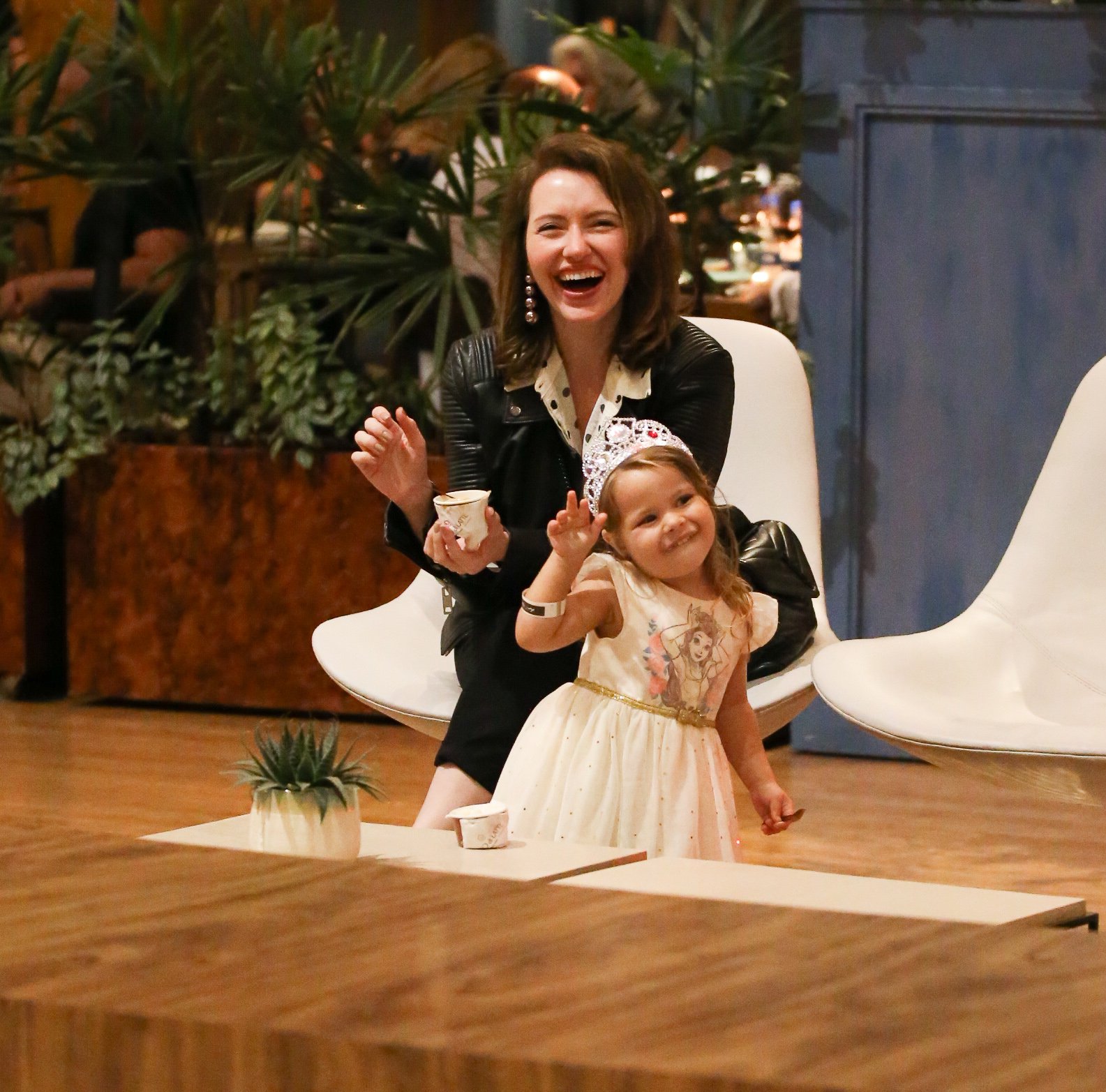 Karin fez questão de acenar para os profissionais e foi imitada pela pequena, que roubou a cena. Chiara desfilou no shopping com um vestido de princesa com direito a sandálias douradas e coroa. A menina já mostrou que é bastante simpática e fez questão de sorrir ao perceber que estava sendo fotografada.
