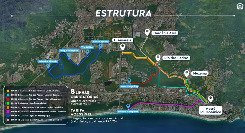 Além disso, serão construídos seis píeres: Salvador Allende, Parque Olímpico, Vila Militar, Arroio Pavuna, BarraShopping e Bosque Marapendi.