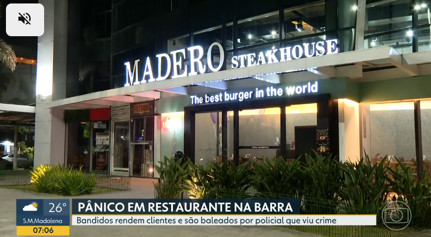 Dois criminosos em uma motocicleta tentaram assaltar um casal que jantava em uma mesa externa do Madero da Av. Lúcio Costa, na altura da Praia do Pepê. Um policial civil à paisana que estava na parte interna viu a movimentação e reagiu a tiros. Um dos suspeitos morreu, e o outro ficou ferido.
